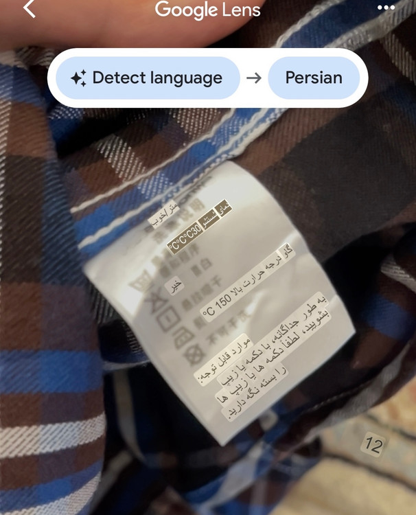 2)هنگامی که لباس شما شناسنامه کالا یا برچسب داخل محصول دارد کافیست در با نبایل در برنامه گوگل لنز دقیقا دوربین گوشی خودراروی شناسنامه محصول نگه دارید وبه وسیله ابزار ترجمه گر ازنحوی شستشو و نگهداری لباس کاملا مطلع شوید