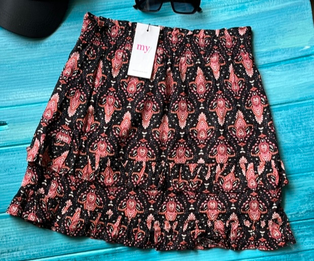 دامن زنانه برند my سه چین جنس نخی خنک و کمرکشی وارداتی چیندار گلدارمشکی وارداتی کرپنخ اعلا