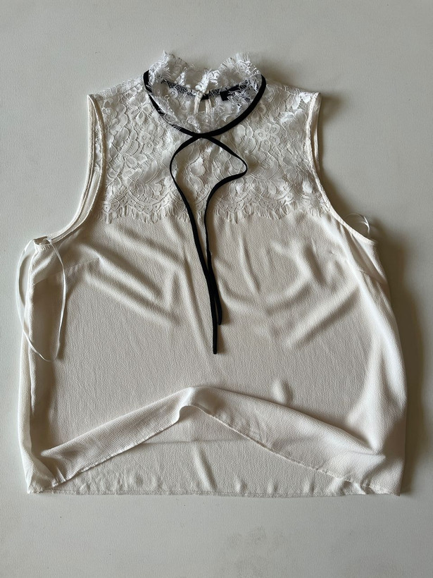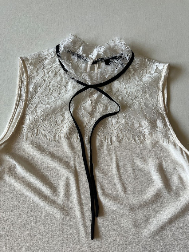 تاپ زنانه مجلسی یقه دانتل کارشده ،محصول Vietnam رنگ شیری خیلی روشن،جنس کرپ کش فوق العاده عالی