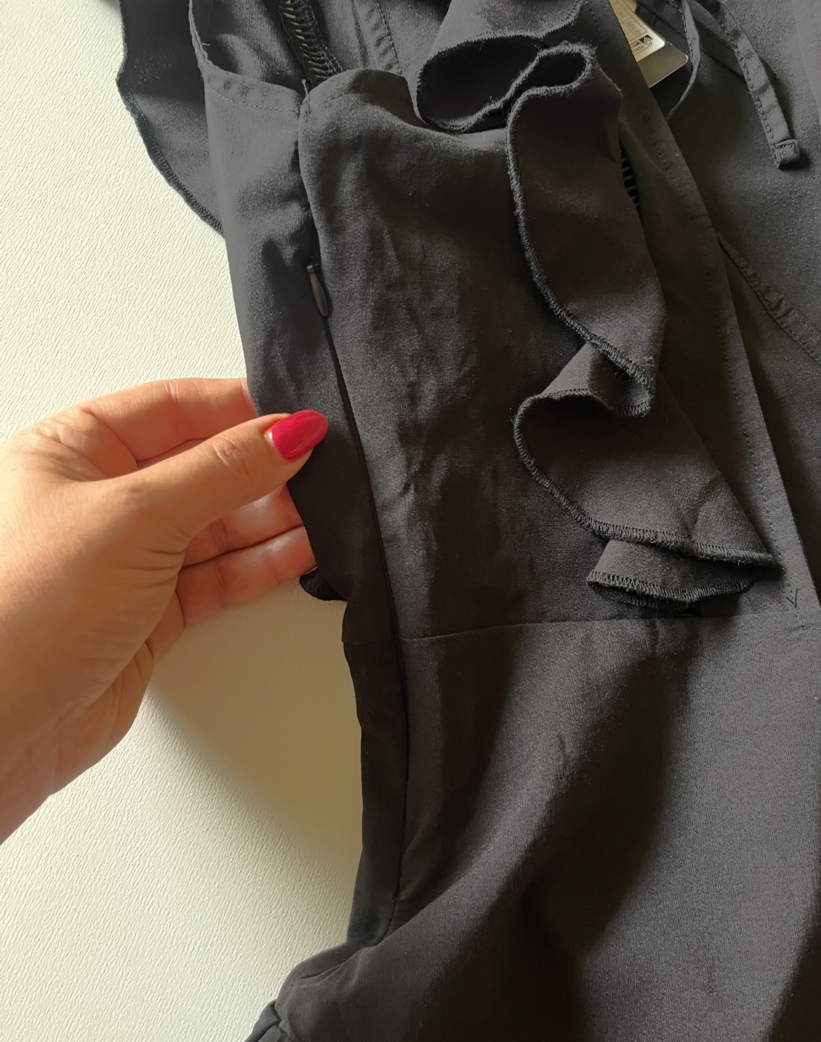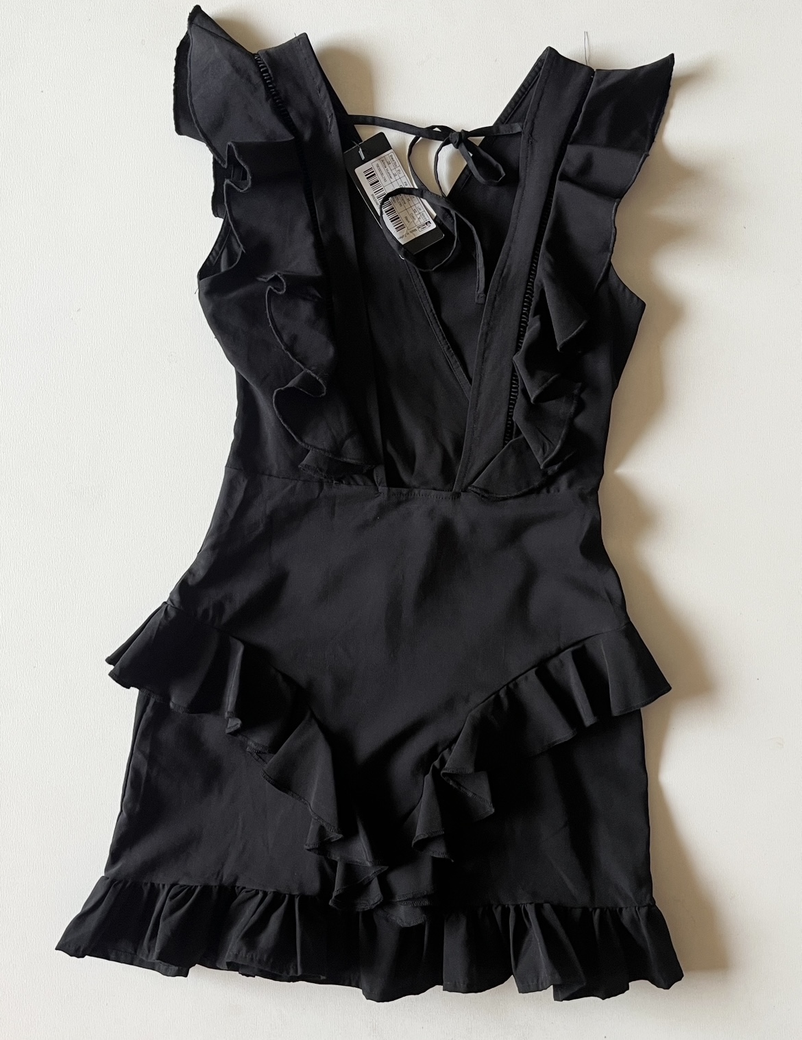 پیراهن زنانه مجلسی برند اصلی TRENDYOLمحصول TURKEY جنس کتان مدل آستین نصفه کوتاه و،خامه دوزی کارشده یقه هفت پشت باز کاملا مشکی بقل زیپ مخفی سایز کوچک تنپوش فوق العاده زیباکد7720