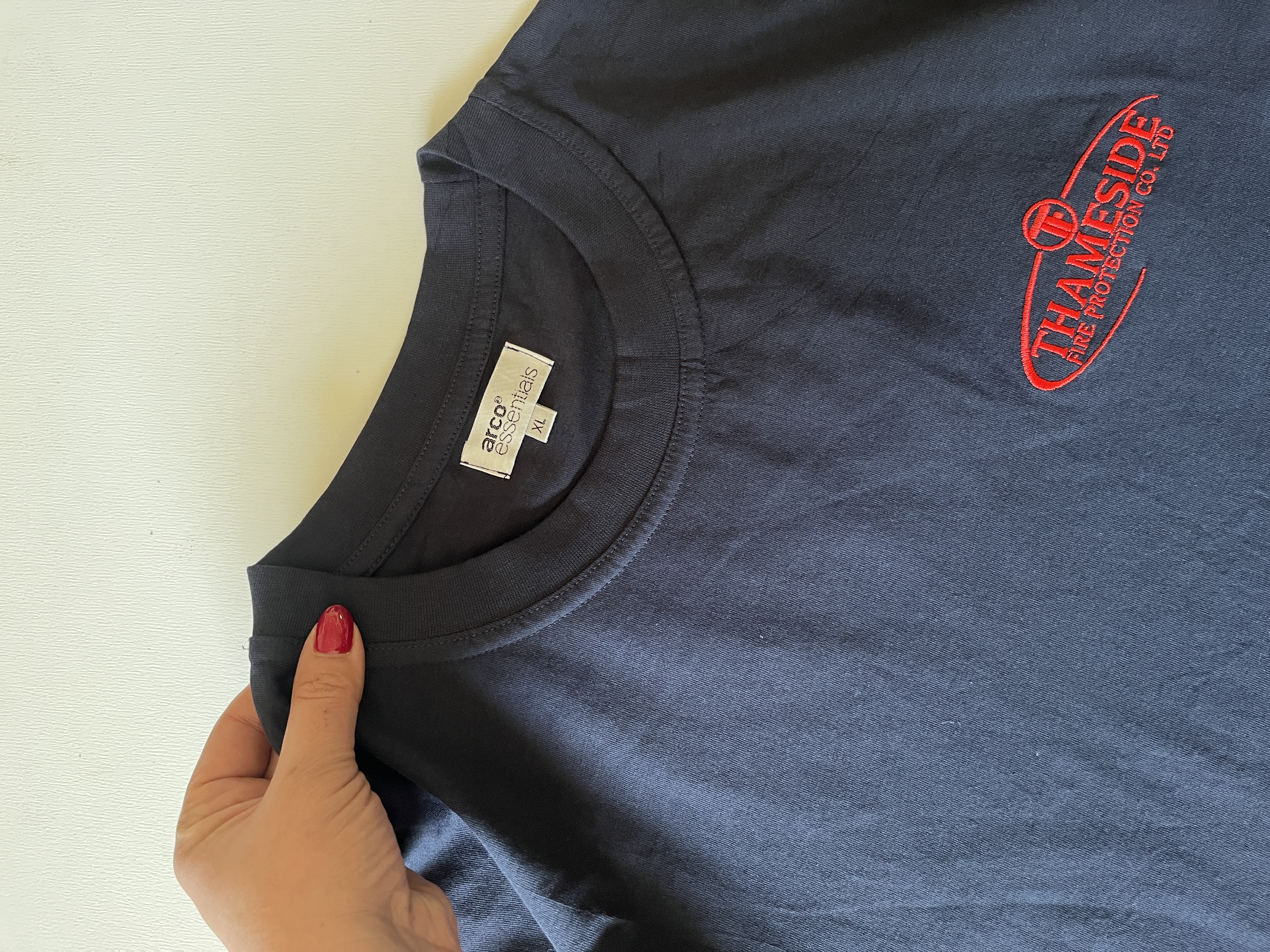 تیشرت مردانه آمریکایی برندarco/essentials،نخپنبه یقه گرد۴سانتی،چاپ تمام گلدوزی ،رنگ سورمه ی خیلی تیره،ضمانت آکبند اورجینال
